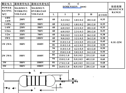 額定電力(W)以數字表示,1/8W,1/6W1/4WS1/4W1/2WS1/2W 1WS1W2WS2W3WS3W5WS5W