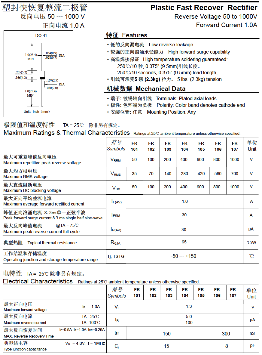 廠家直銷插件快恢復二極管FR101~FR107