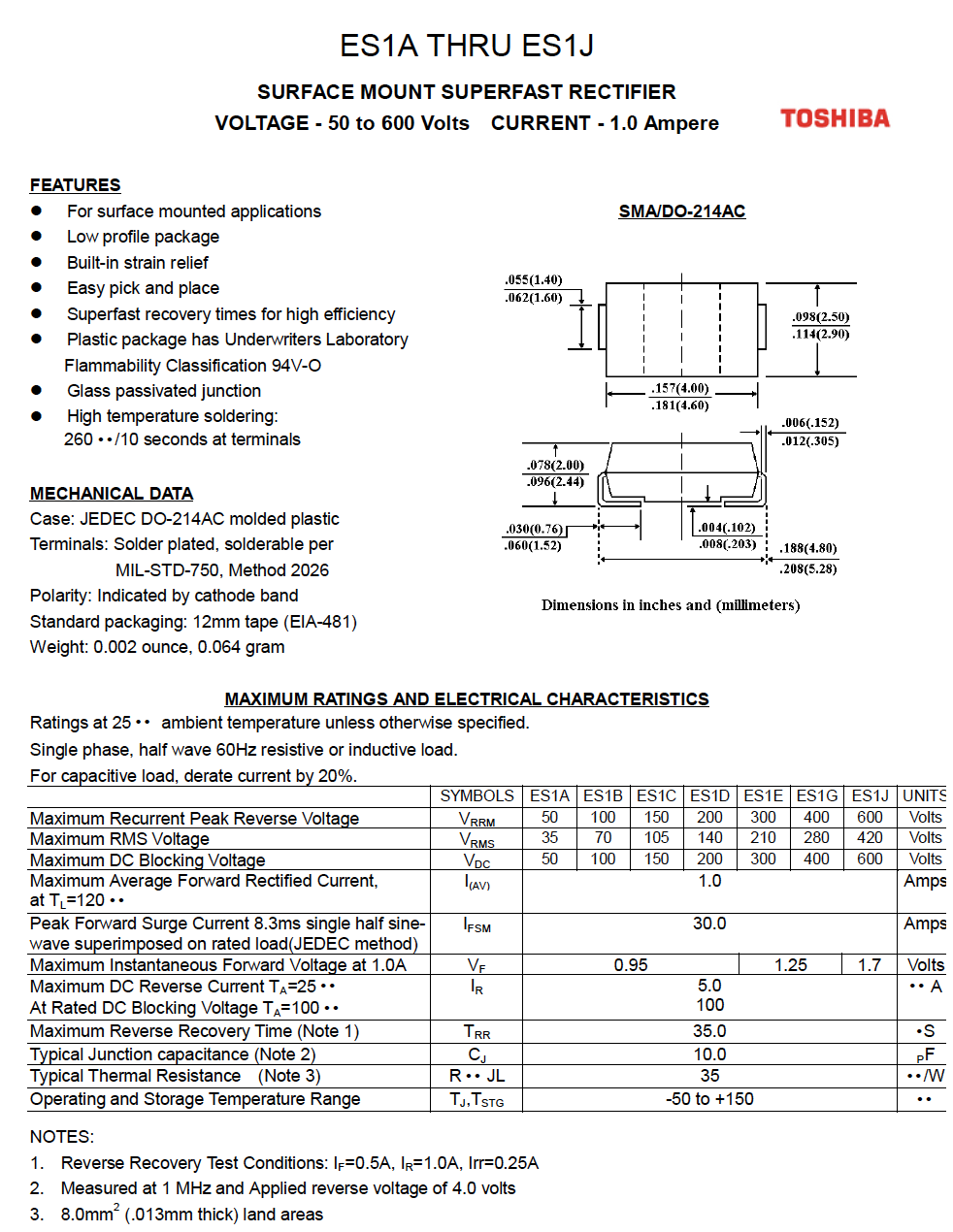快恢復二極管SMA封裝 ES1A~ES1J